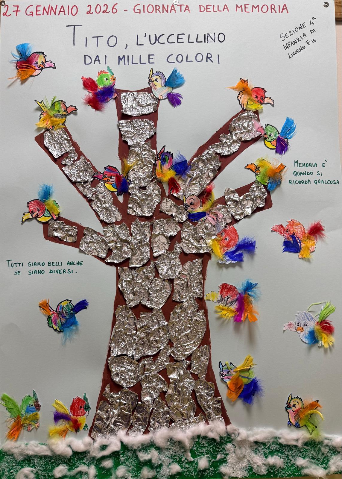 I bambini della Scuola dell’Infanzia di Livorno Ferraris hanno celebrato la Giornata della Memoria attraverso i cartelloni ispirati alle storie “Ogni merlo è un merlo” e “L’uccellino dai mille colori”. Un percorso fatto di immagini e colori per riflettere insieme sul valore della diversità, dell’accoglienza e del rispetto di ogni individuo.