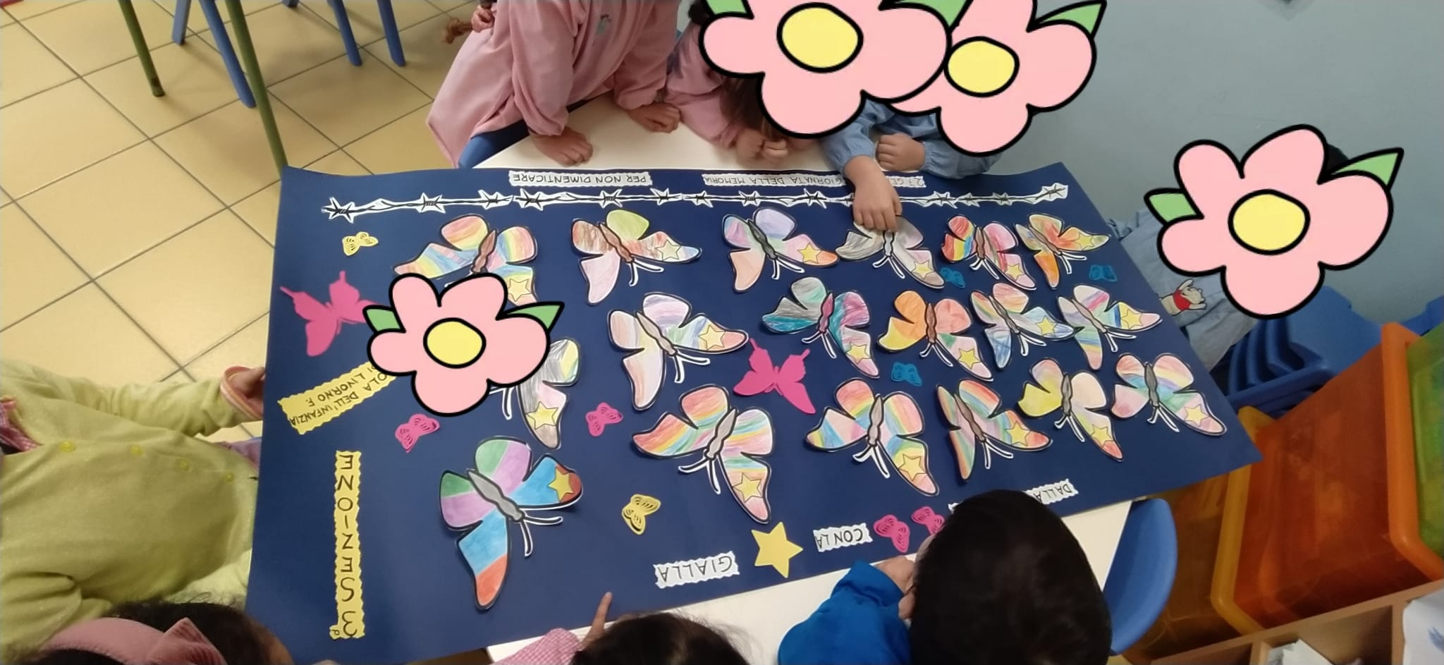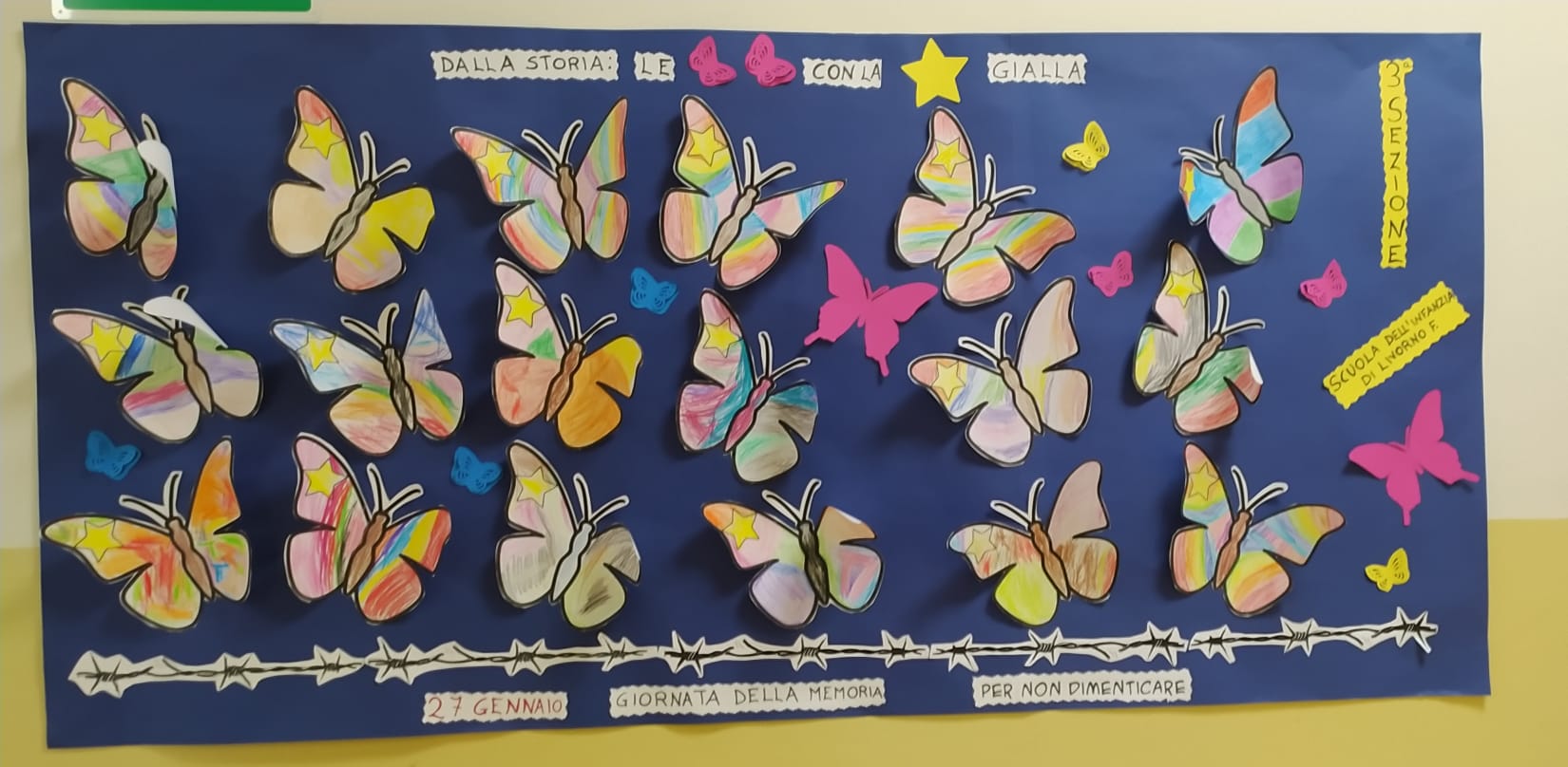 Il 27 gennaio, in occasione della "Giornata della memoria", i bambini della terza sezione, dopo aver assistito alla visione della storia animata "Le farfalle con la stella gialla", e aver riflettuto sull'importanza di non dimenticare gli sbagli per non ripeterli e di rispettare le diversità di ognuno, hanno realizzato sotto la mia guida un cartellone a tema.